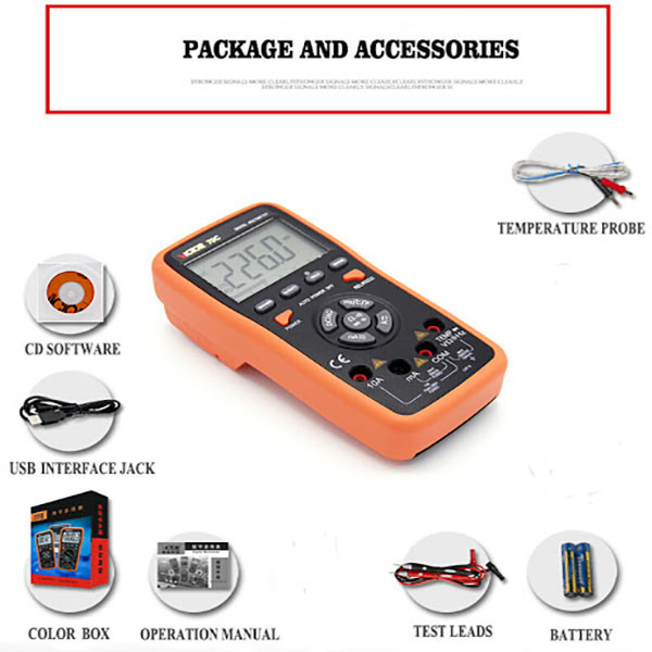 یک جفت پروب ، باطری نیم قلم دو عدد ، ترموکوپل K ، کابل رابط USB ، سی دی نرم افزار ، دفترچه کار
