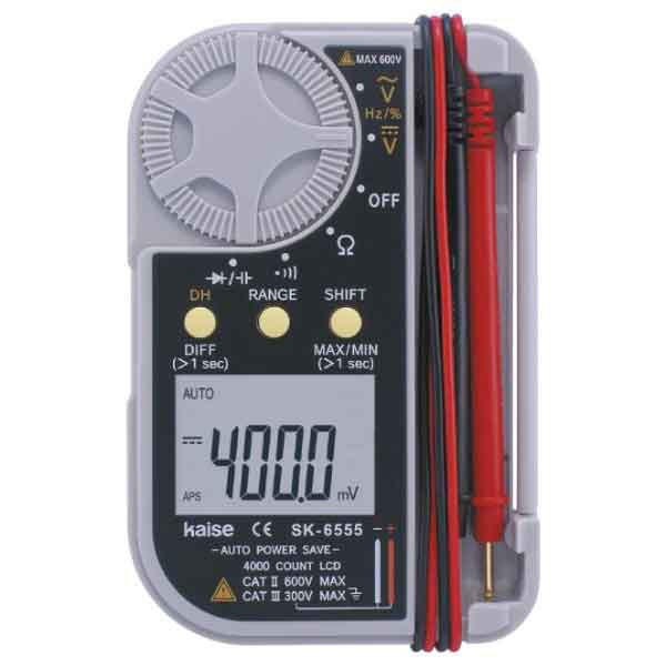 مولتی متر جیبی ساخت شرکت کیس ژاپن مدل SK 6555 جهت اندازه گیری انواع پارامترهای الکتریکی مورد استفاده قرار می گیرد. به کمک این مولتی متر سایز جیبی ساخت ژاپن علاوه بر ولتاژ مستقیم و متناوب میتوانید مقدار فرکانس و ظرفیت خازن و همچنین مقاومت الکتریکی و تست دیود و بازر را با دقت مناسب اندازهگیری کرد.