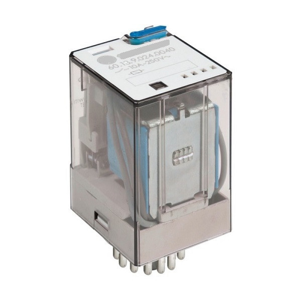 میتوان گفت که رله به عنوان یک تقویت کننده نیز به حساب می آید چرا که ورودی با جریان کم و خروجی با جریان بالا را میتوان از آن دریافت کرد. رله بسته به نوع ساخت آنها دارای 2 پایه برای تغذیه بوبین و یک یا چند تیغه ی COM (مشترک) و یک یا چند تیغه بسته (NC) و یک یا چند تیغه باز (NO) را دارا می باشند. تعداد کنتاکت آن3 و تعداد پایه 11 میباشد.جنس کنتاکت نقره – نیکل و ولتاژ تحریک آن 24 ولت DC است.ظرفیت جریان هر کنتاکت 10 آمپر میباشد.و نوع کنتاکت باز و بسته است. .