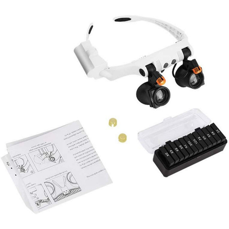 سایر توضیحات: یک عدد ذره بین دو چشمی لنزهای همراه دستمال تمیز کننده دو عدد کاور led نارنجی دو عدد کاور led زرد راهنمای استفاده از ذره بین
