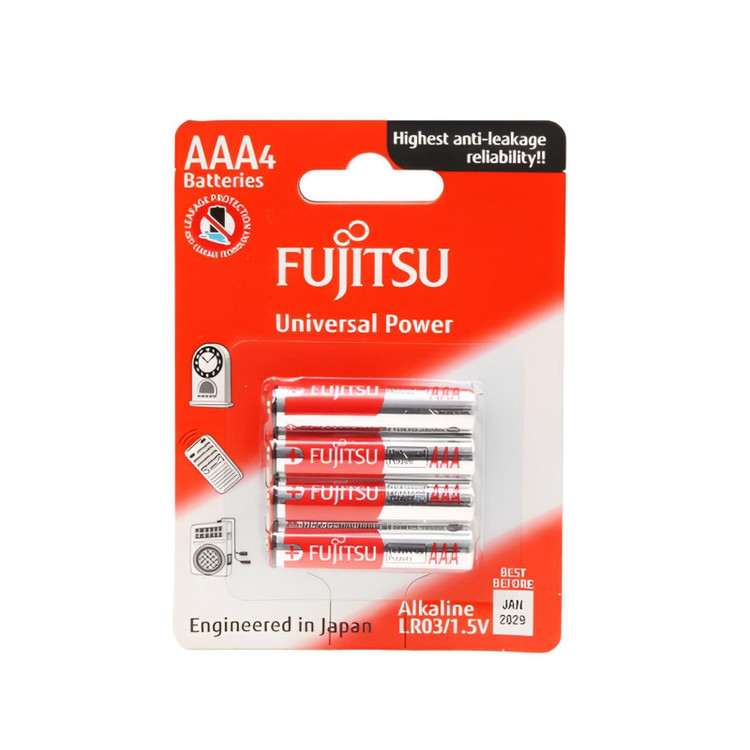 تکنولوژی باتری آلکالاین مارک باتری FUJITSU ولتاژ باتری 1.5 ولت سایز باتری نیم قلمی AAA مدل LR03 حداکثر قطر خارجی 10 میلی متر حداکثر ارتفاع 44 میلی متر قابلیت شارژ ندارد بسته بندی دوتایی بهترین زمان مصرف قبل از 2029/01 ساخت کشور ژاپن