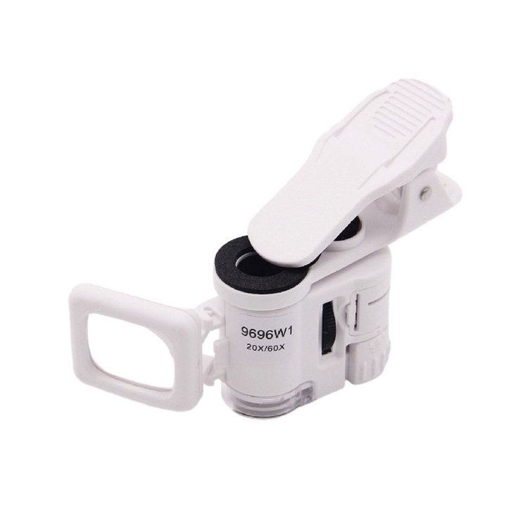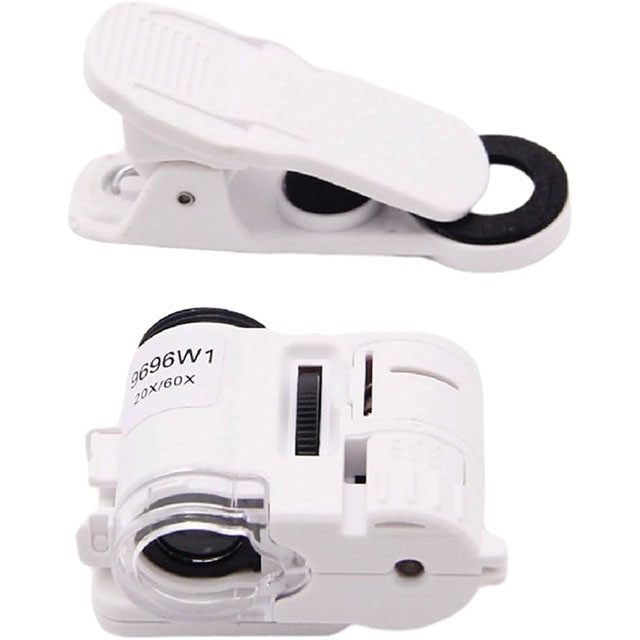 میکروسکوپ – لنز کلیپسی گوشی موبایل 60X یونیورسال با لنز بغل تاشو 20X مدل 9696W1 ذره بینی کوچک و قابل حمل در جیب با زوم 20 و 60 برابر و مدل کلیپسی گیره دار مناسب اتصال به گوشی موبایل دارای ذره بین مربعی بغلی میباشد. موبایل های هوشمند امروزی از بسیاری از کامپیوتر های چند سال قبل هم سریع تر و هم قوی تر شده اند از این رو هر روزه گجت های متنوع و کاربردی فراوانی مخصوص موبایل طراحی شده و معرفی می شوند.این میکروسکوپ موبایل با بزرگنمایی 60 برابر در واقع یک لنز مخصوص موبایل است که بهمراه کلیپس خود می تواند بروی دوربین انواع موبایل نصب شده و دوربین موبایل رو به یک میکروسکوپ تبدیل کند. پس اگر به دنبال میکروسکوپ قابل حمل هستید، این گجت گزینه مناسبی می باشد. این میکروسکوپ موبایل با قدرت بزرگنمایی 60 برابری، دارای قیمت ارزان و کیفیت قابل قبولی می باشد و دارای توان مصرفی پایینی است که امکان نصب بر روی انواع تلفن همراه و تبلت ها قابل نصب می باشد. از آنجائیکه منبع نور این دستگاه درست در امتداد لنز اصلی آن قرار داشته و نور از بالا بروی نمونه تابیده می شود از این رو برای رویت سطح هر جسمی میتوان از آن استفاده نمود مانند سطح کاغذ، سطح برگ، مشاهده مدارهای الکترونیکی (مدار چاپی)، مشاهده جواهرات و سنگ های قیمتی، مشاهده امور مختلف زمین شناسی ، استفاده برای صنعت چاپ و دهها صنعت دیگر. دارای دو عدد چراغ LED می باشد که یکی از آنها سفید و برای روشن کردن زمینه بوده و چراغ دوم نور آبی UV جهت تست اسکناس می باشد. قسمت بالائی این ذره بین همانند تلسکوپ یا دوربین تک چشمی بصورت طولی بزرگ و یا کوچکتر می شود؛ و امکان زوم را میدهد. کلید این ذره بین دو حالته می باشد و با باطری کوچک ساعت کار می کند و بسیار کم مصرف است. فاصله ای که از جسم مورد نظر باید گرفت تا واضح دیده شود مماس تا 1 سانتی متر میباشد.