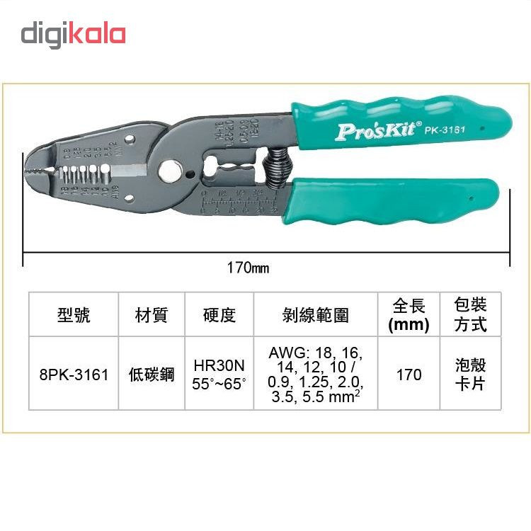 سیم لخت کن 0.9 ، 1.25 ، 2.0 ، 3.5 و 5.5 میلی متر سیم لخت کن 18، 16 ، 14 ، 12 و 10 AWG سیم چین پرس سرسیم از 1.25 تا 2.0 و 0.5 تا 0.9 میلی متر دارای فنر جهت باز شدن خودکار انبر و سهولت در کار