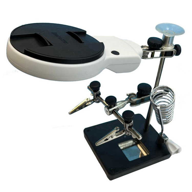 گیره مونتاژ ذره بین دار بزرگ به همراه پایه هویه مدل MG16129AC قطر ذره بین اصلی 90 میلی متر بوده و اندازه قطر جانبی 19 میلی متر میباشد همچنین دارای LED با کاور متحرک نارنجی جهت استفاده از نور آفتابی یا مهتابی و ایجاد نور کافی در هنگام لحیمکاری می باشد. گیره کمکی مونتاژ مناسب و کاربردی برای ساخت و مونتاژ قطعات حساس، ایده آل برای همه ی کاربردهایی که نیاز به دست سومی دارند! در این مدل پایه سنگین تر و ذره بین متوسط است، تا پایداری و دقت بیشتری صورت گیرد، علاوه بر این مجهز به 3 LED کم مصرف که با سه باتری AAA (نیم قلمی) و همچنین قابلیت شارژ با برق شهری به وسیله آداپتور (شامل محصول نیست)جهت روشنایی بیشتر و بهتر استفاده می شود.