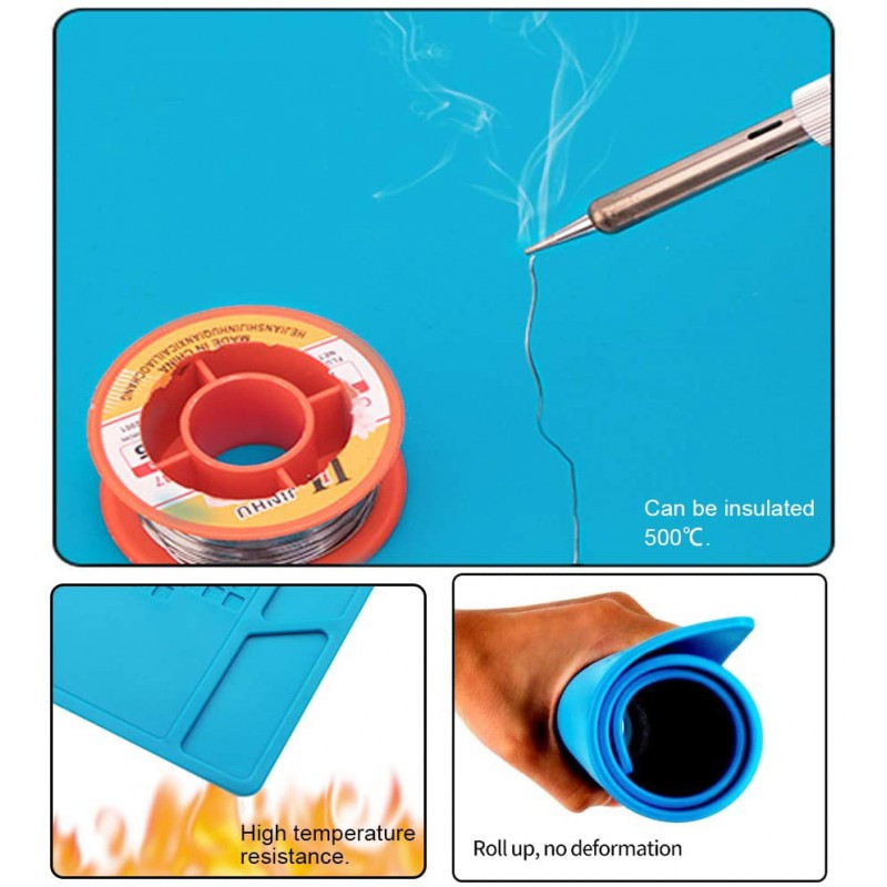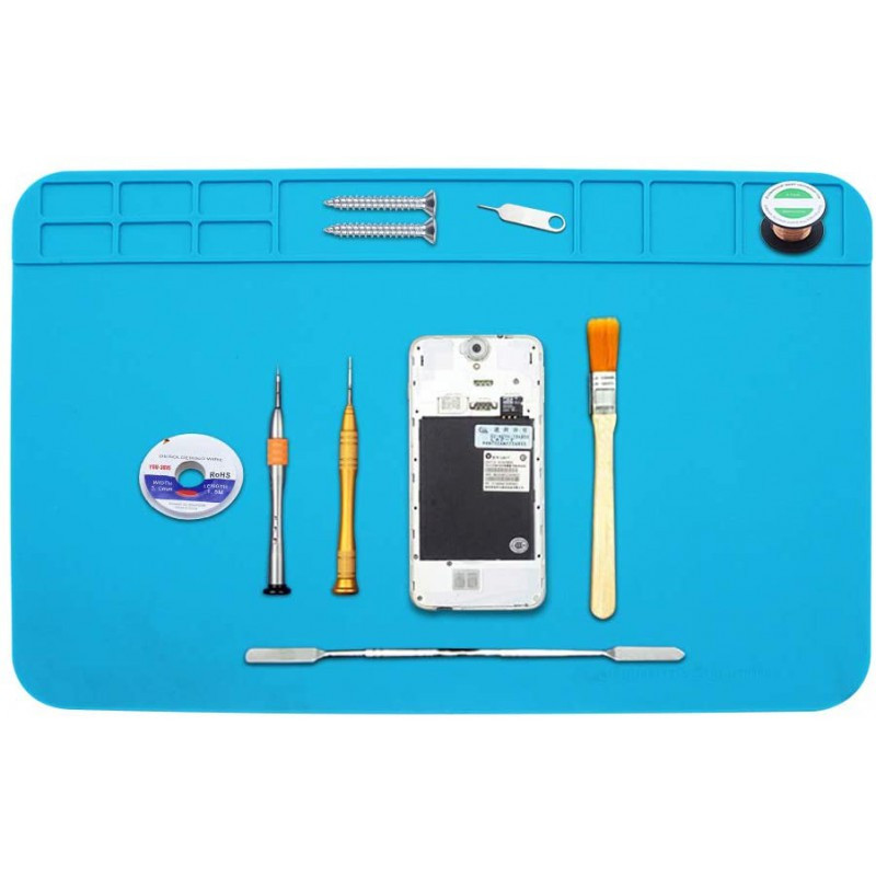 این صفحه مناسب برای کار مونتاژ و یا تعمیر موبایل و یا مونتاژ بردهای الکتریکی می باشد. جنس این صفحه از سیلیکون است و نسوز می باشد. دارای بخش های مختلف جهت نگهداری آی سی های SMD و دیپ ، لوازم مونتاژ ، صفحه ی برد PCB یا برد موبایل و … می باشد.
