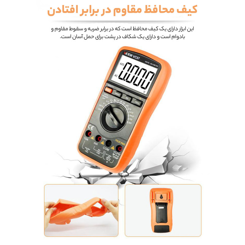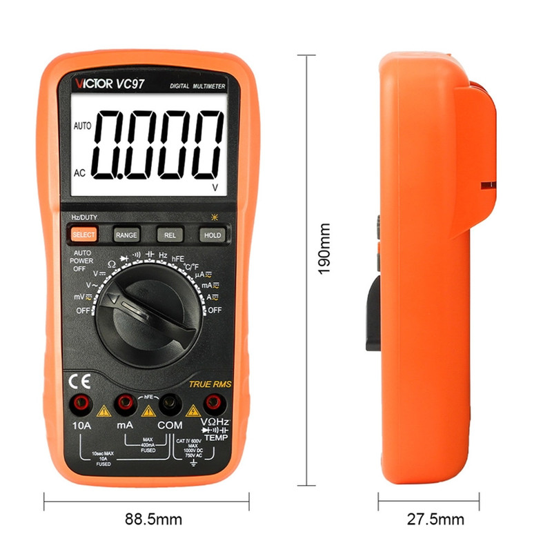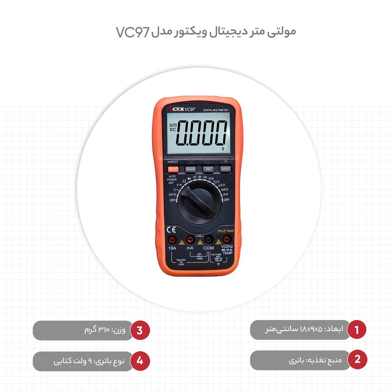 مولتی متر دیجیتال ویکتور VC97 یکی از کامل ترین مولتی متر های برند ویکتور بوده که از امکانات بسیار بالایی برخورداراست. از جمله ویژگی های این دستگاه می توان به قابلیت اندازه گیری خازن، اندازه گیری دما، اتورنج بودن و True RMS اشاره کرد